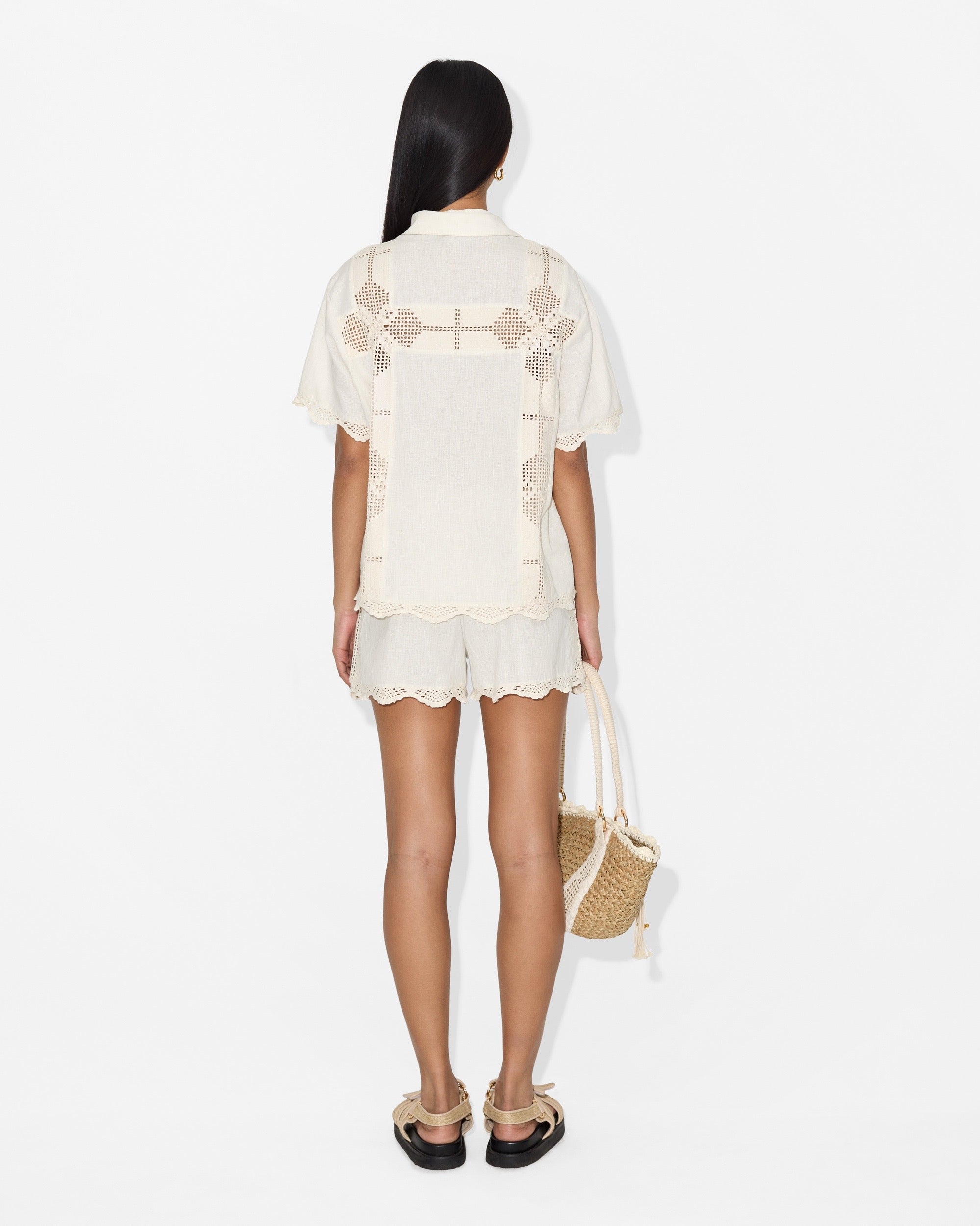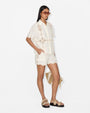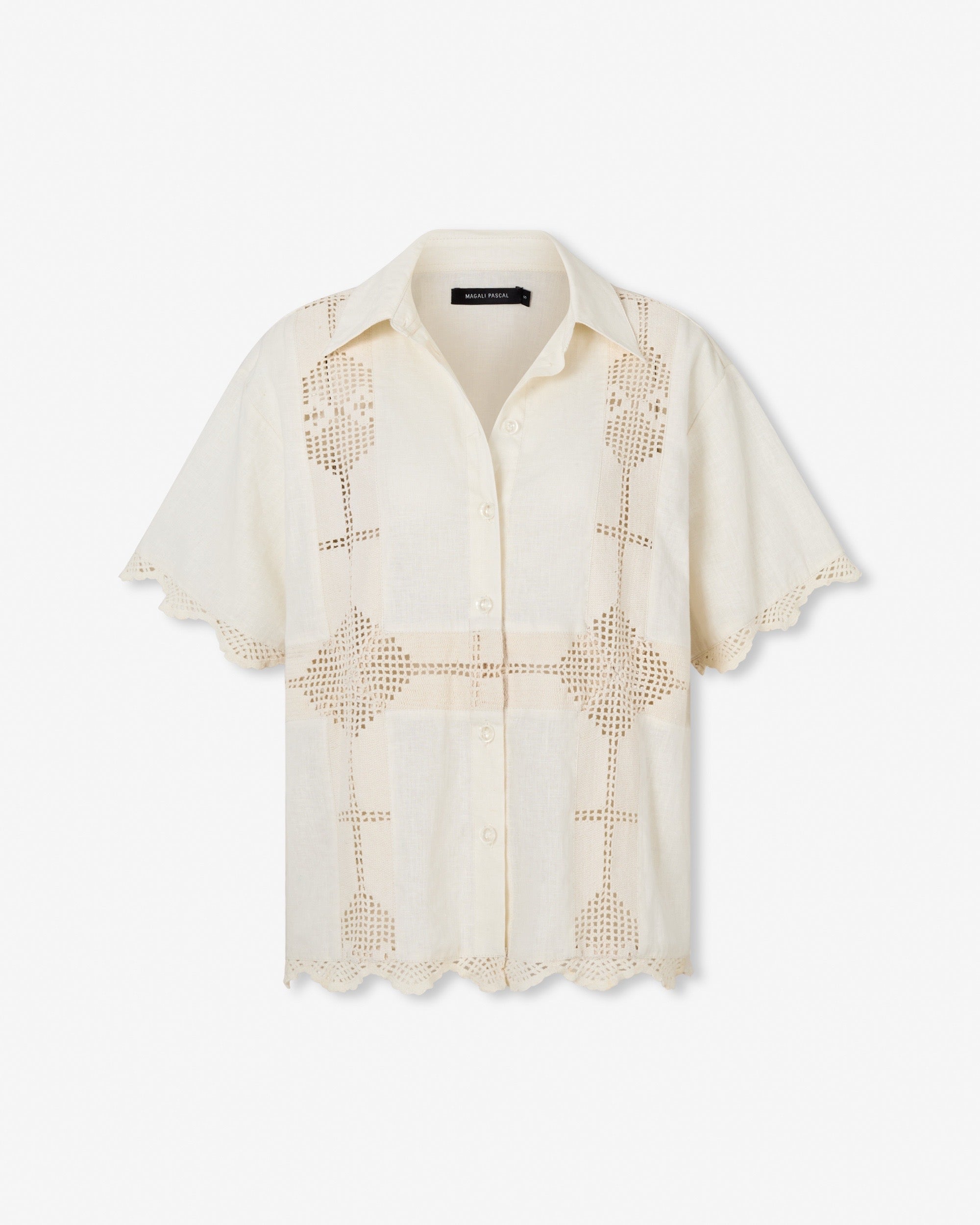 The Charlotte Shirt blends classic tailoring with delicate feminine details. Crafted in a breathable cotton-linen blend, the piece is elevated by intricate lace panels and soft edging that bring a light, refined charm to the silhouette.