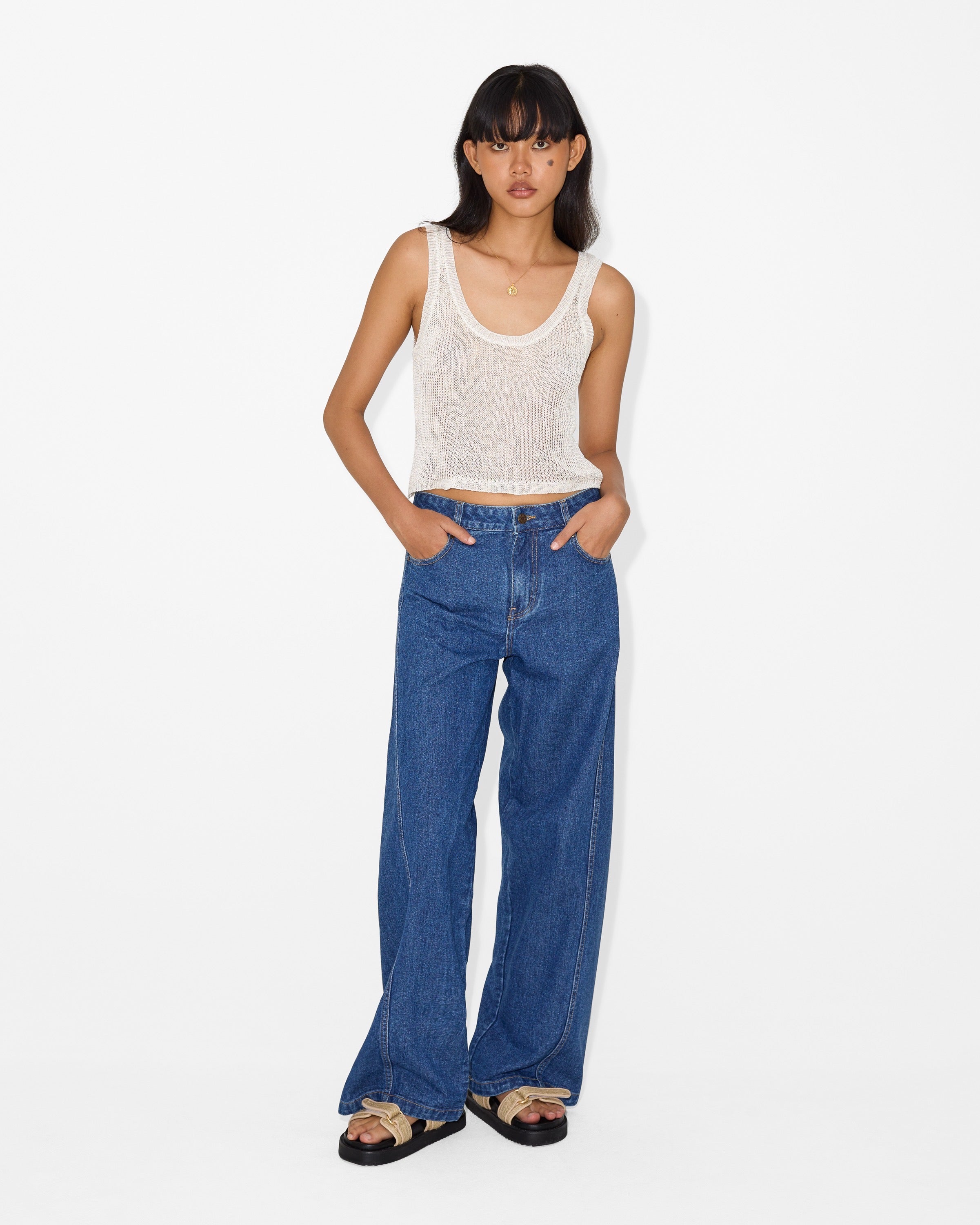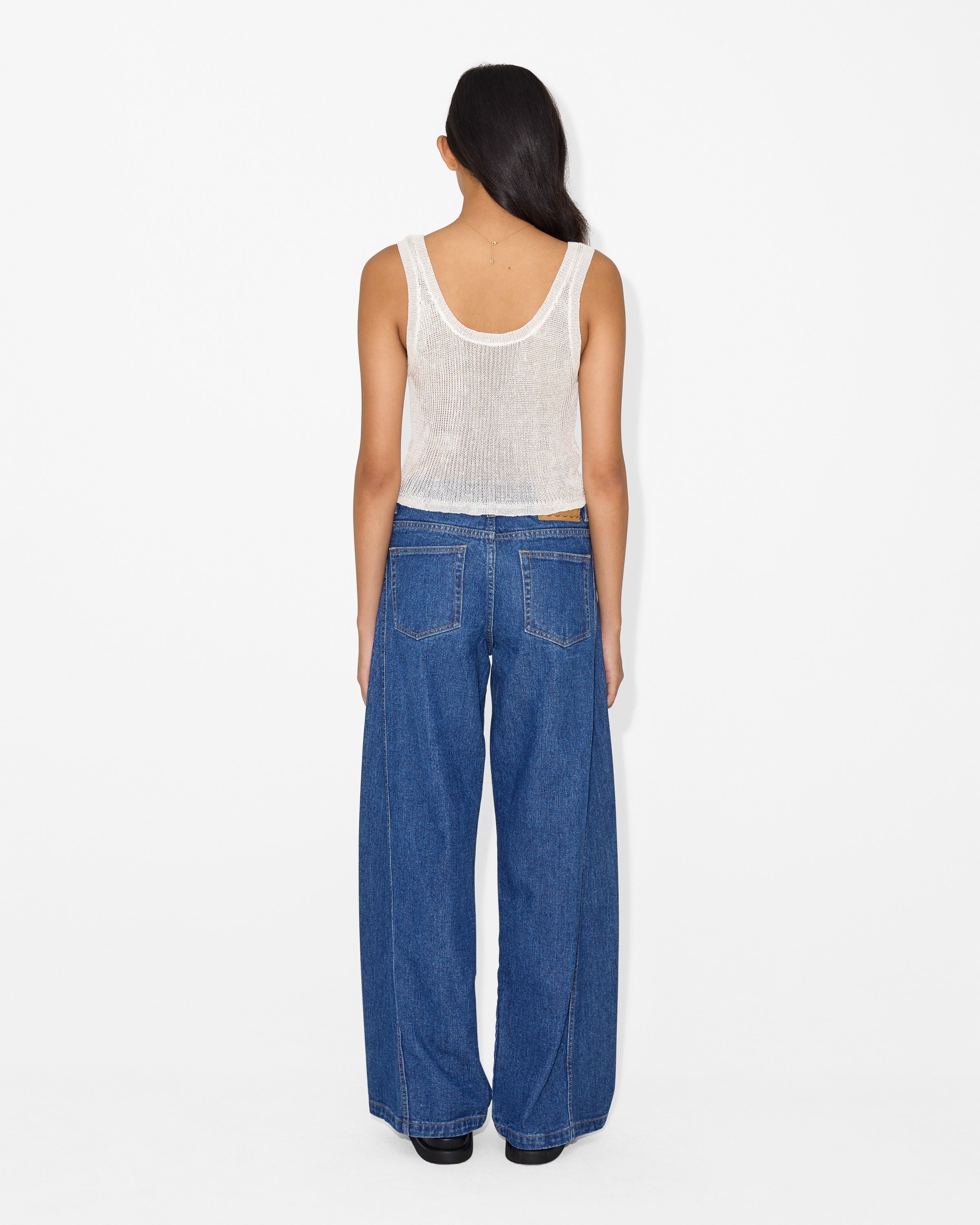 The Ninon Jeans are a modern denim essential designed with a clean, elongated silhouette. Crafted from soft structured denim, they feature a high-waisted fit with straight wide legs and subtle contrast panel detailing that enhances the leg line. Finished with classic five-pocket styling and a single-button zip closure for effortless everyday wear.
